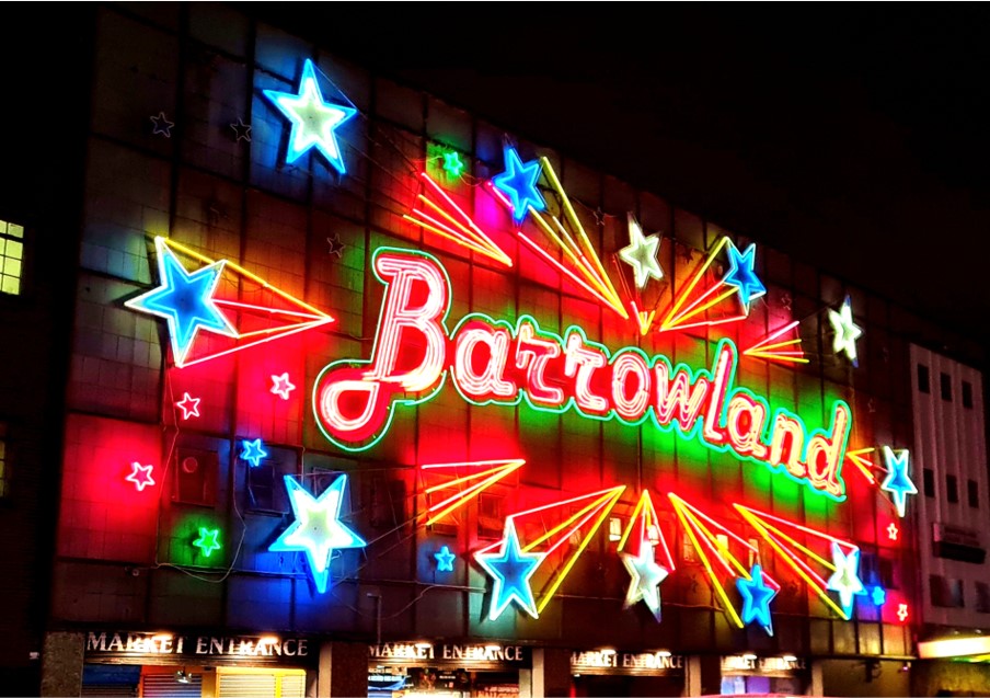 This greetings card features the iconic neon sign above the entrance to the Barrowland Market and Ballroom in the East End of Glasgow. The Barrowland Market, known locally as the Barras, was created by Maggie and James McIver on land they purchased in 1921, and it quickly grew into one of the largest indoor markets in Britain. in the 1930s, a function room was added which later became the Barrowland Ballroom. More recently, it has become a legendary music venue, which is famous for its atmosphere and is one of Glasgow’s favourite spots for live music. The current sign was created in 1985 and is believed to be the largest sign of its kind in the UK.
