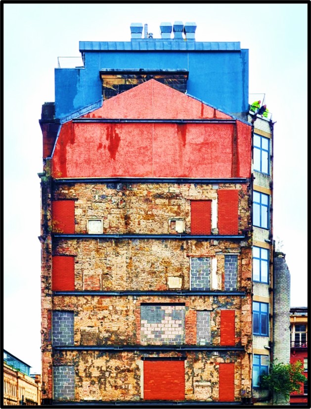 A ghost building is the outline left on a neighbouring wall when a building is demolished. These can create an intriguing mix of textures and patterns which can reveal the complex history of a particular plot. This print is of a ghost building on Brunswick Street in the Merchant City area of Glasgow.