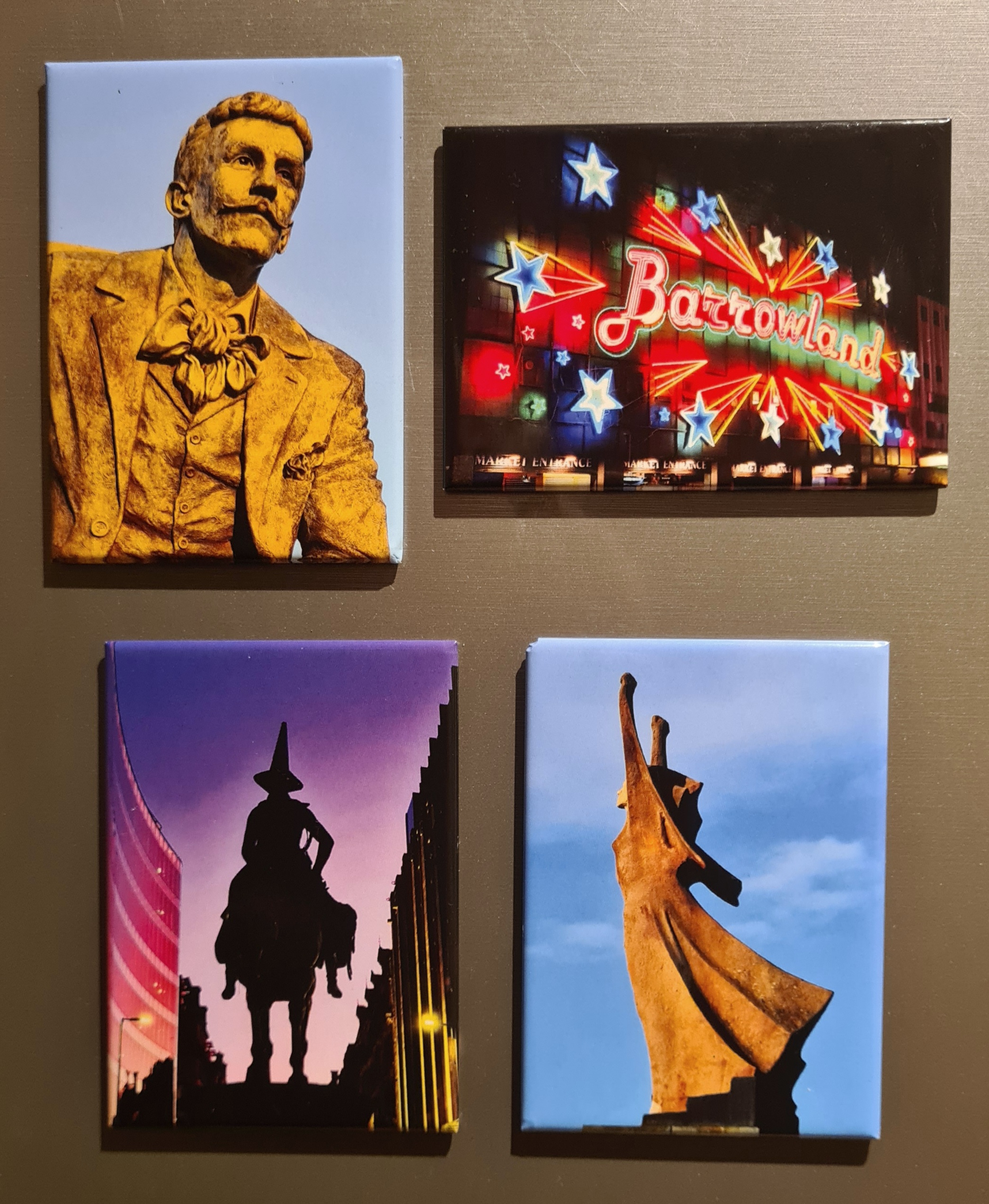 This is a set of four high quality fridge magnets, each which features a Glasgow Icon. These include the Barrowland Neon Sign, the Duke of Wellington Statue at sunrise, Andy Scott’s statue of Charles Rennie Mackintosh and the International Brigade Memorial on Clyde Street.