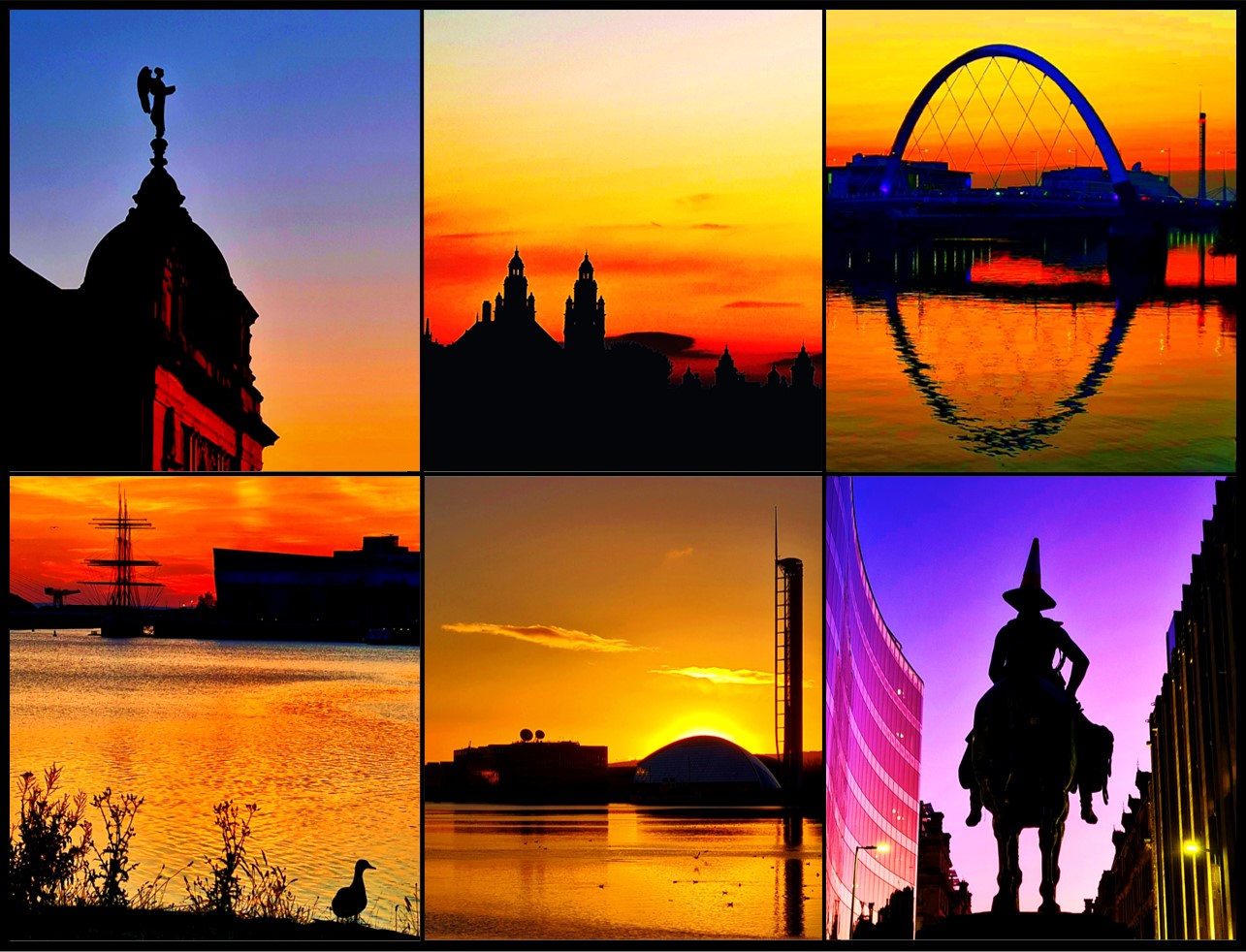 This is a collage of photographs of sunrises and sunsets in Glasgow taken by Colin M. Drysdale. Top left: Dennistoun Library; Top middle: Kelvingrove Art Gallery; Top right: The Squinty Bridge; Bottom left: The Clyde at the Riverside Museum; Bottom middle: The Glasgow Science Centre and Tower; Bottom right: The Duke of Wellington. The print itself is 7.25 inches by 9 inches (18.5 cm by 23cm), and it comes mounted in white 1.5 inch (3.5 cm) mount with a total size of 10 inches by 12 inches (25.5 cm by 30.5cm).