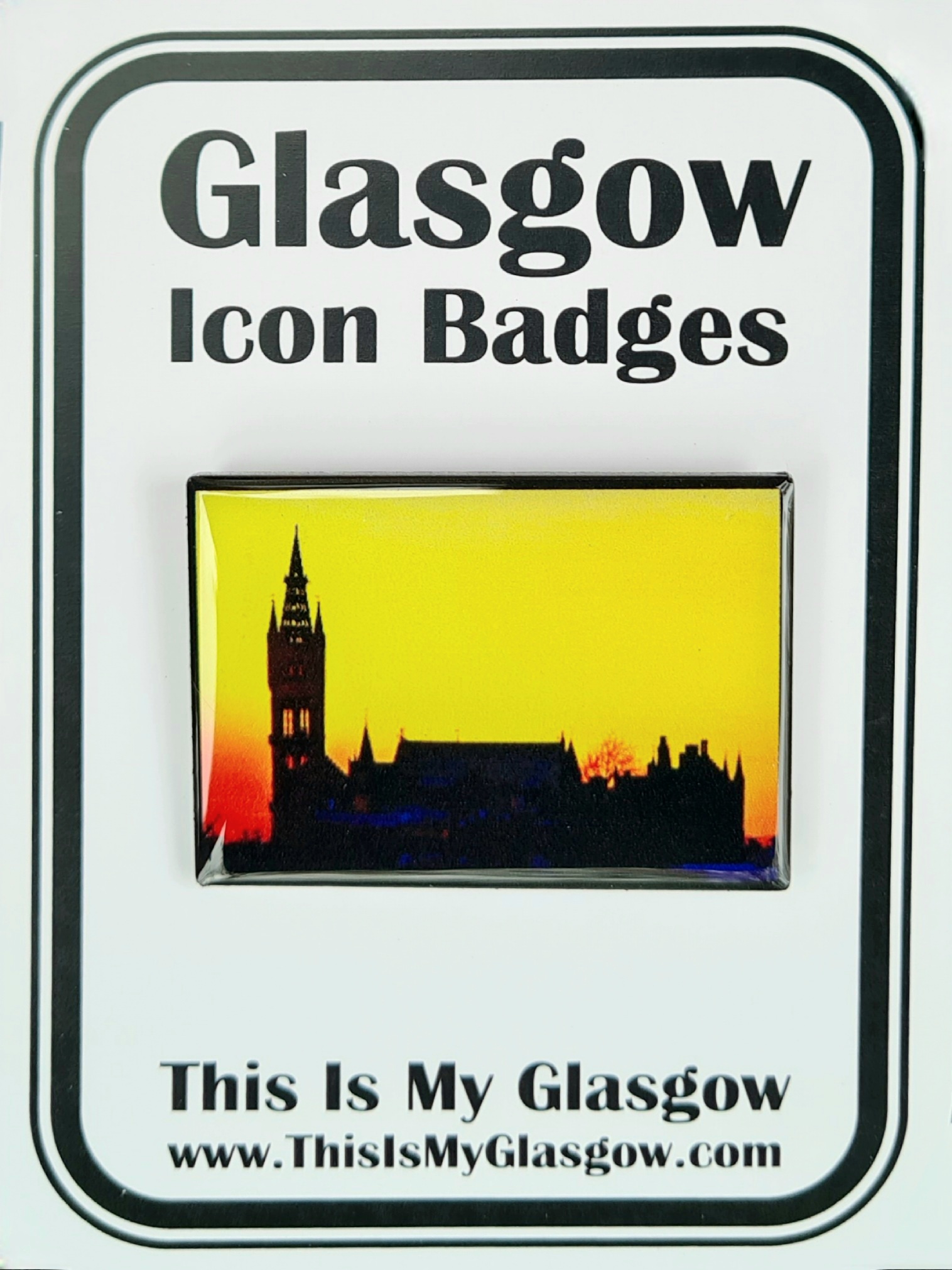 Sunset behind the gothic main buildings of Glasgow University as seen from the nearby Kelvingrove Park. These buildings were designed by George Gilbert Scott and were constructed in the 1860s. This recycled metal pin badge features a high quality print of this image, which is then covered in a protective acrylic dome. On the back is a single pin with a butterfly clasp to keep it securely in place. The badge is 4cm by 3cm in size and comes mounted on a Glasgow Icons card backing in its own clear cellophane envelope.