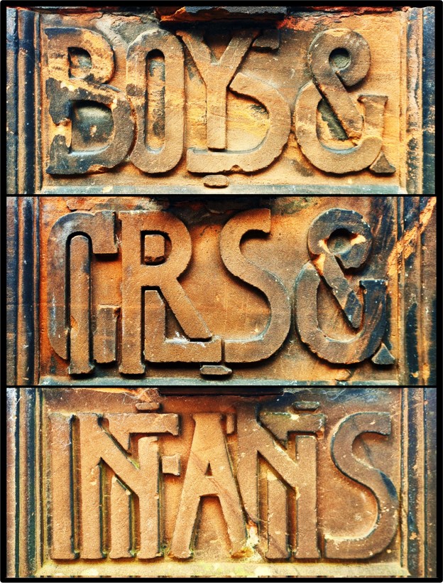 These ghost signs are carved into the gateposts of the former Haghill Public School in the East End of Glasgow. When it was built in 1904, all public schools in Glasgow were required to have separate entrances for boys and girls, and many also had separate entrances for infants. Designed by A. Lindsay Miller, the school was demolished in 2022, but the gateposts remain standing, and will hopefully be incorporated into the affordable housing planned for the site. The font used for these signs is very distinct, and is unique to this school. This was by no means unusual for Glasgow schools, and many had their own unique font for such signs.