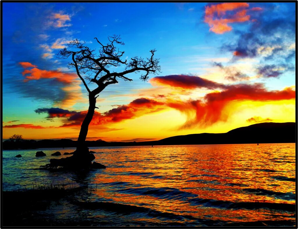Milarrochy Bay on Loch Lomond, less than an hour from Glasgow, is a popular spot with both locals and visitors. One of its most notable features is a lone oak tree, which for much of the year us surrounded by water. With the hills on the western side of Loch Lomond in the distance, it has become one of the best known, and most photographed, trees in Scotland. This photograph was taken at the end of February, when the sun sets behind the tree, creating a dramatic effect as the sun drops behind the distant hills, and casting a golden glow on the the rain clouds drifting across the loch.