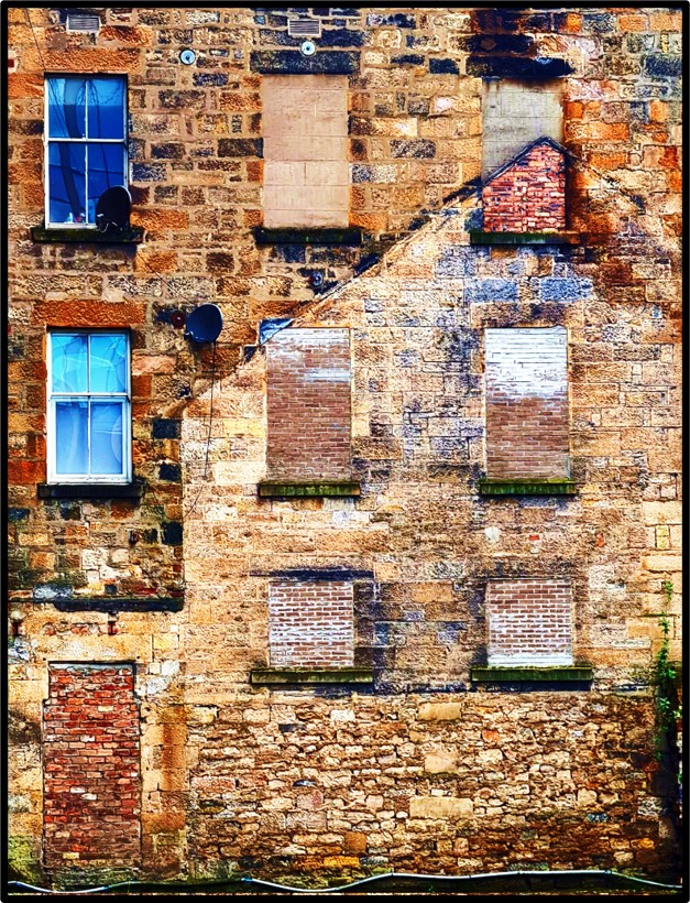 A ghost building is the outline left on a neighbouring wall when a building is demolished. These can create an intriguing mix of textures and patterns which can reveal the complex history of a particular plot. This print is of a ghost building on Robertson Street in central Glasgow.