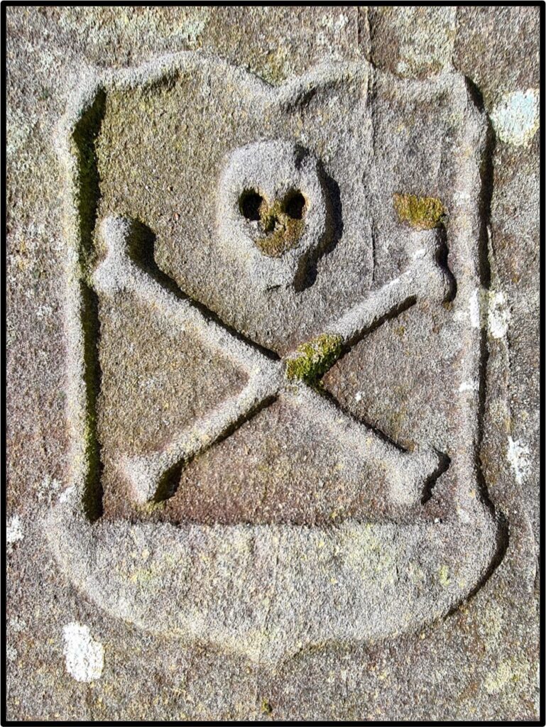 Memento mori, or reminders of death, and frequently feature on Scottish gravestones of the 17th and 18th centuries. One of the most common is the skull and crossbones. These are often interpreted as marking a grave of someone who died of the plague or a pirate, they have nothing to do with the former, and are only loosely connected with the latter. The skull and crossbones flag we now associate with pirates were first used on gravestones in Scotland and Ireland and had nothing to do with pirates, but was borrowed by the Irish pirate Edward English in the early 18th century as a way to show his enemies they risked death if they fought them. This example of a skull and crossbones memento mori comes from an old gravestone in the churchyard of the 18th century Curmunnock Parish Church on the southern edge of Glasgow.