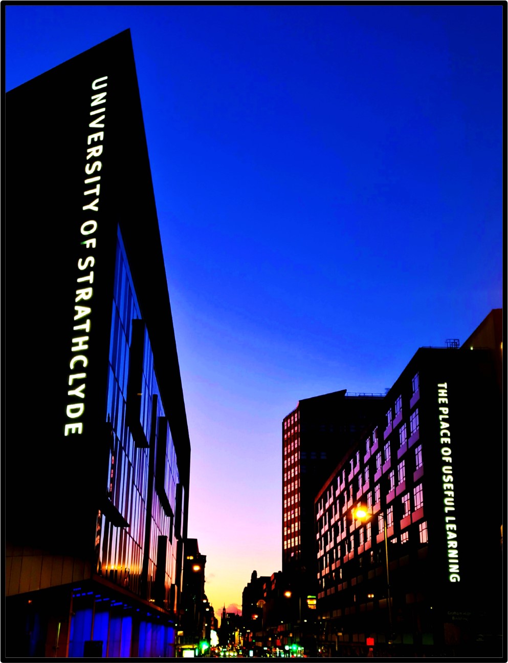 This print is a photograph looking along George Street at sunset through the heart of the campus of the University of Strathclyde in central Glasgow. The print itself is 7.25 inches by 9 inches (18.5 cm by 23cm), and it comes mounted in white 1.5 inch (3.5 cm) mount with a total size of 10 inches by 12 inches (25.5 cm by 30.5cm).