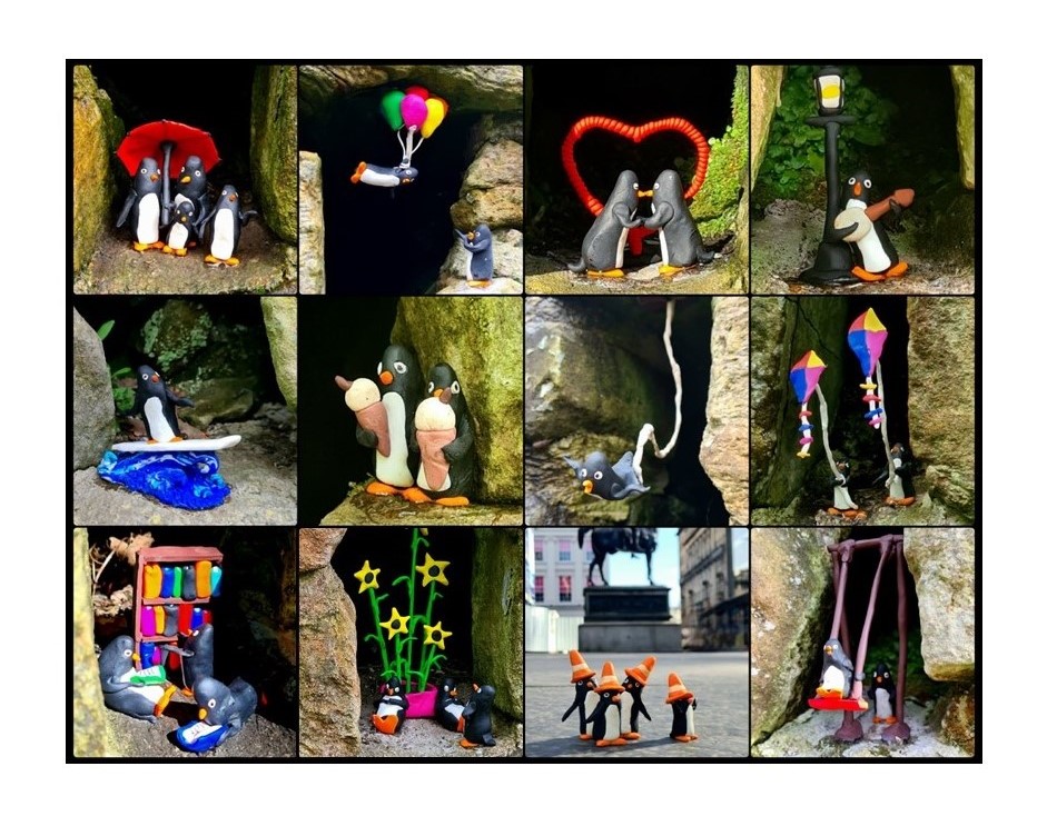 This print consists of twelve of pictures of the Glasgow Penguins. Starting as a guerilla art project in 2023, these are small model penguins which regularly appear in the nooks and crannies of an old wall on the Kelvin Way in the West End of Glasgow. The print itself is 7.25 inches by 9 inches (18.5 cm by 23cm), and it comes mounted in white 1.5 inch (3.5 cm) mount with a total size of 10 inches by 12 inches (25.5 cm by 30.5cm).